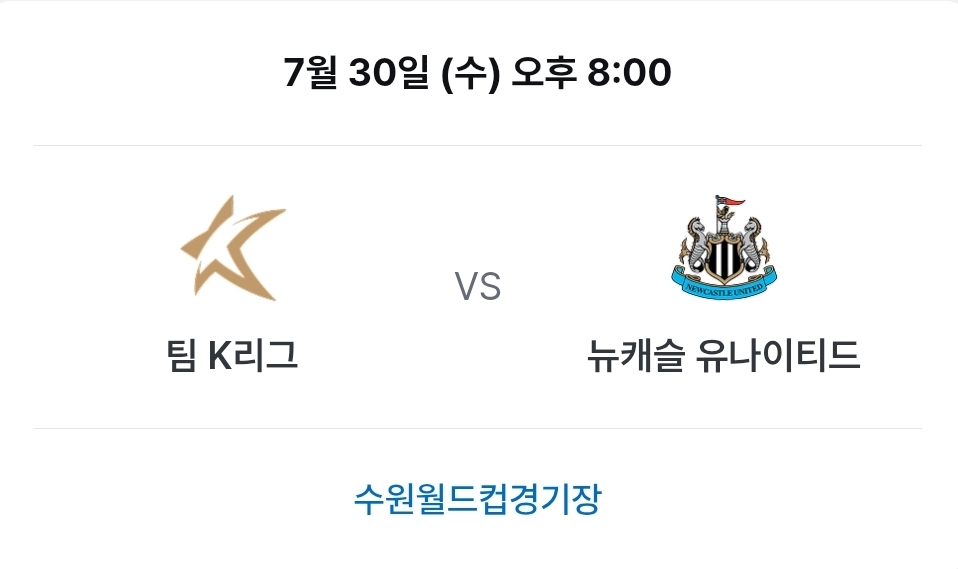 | 팀 K리그 vs 뉴캐슬 | 2025년 7월 30일 (수) 오후 8시 | 수원월드컵경기장 | 쿠팡플레이 |
