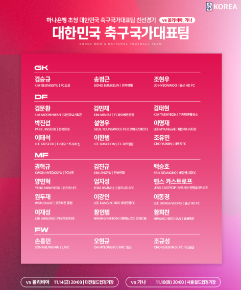 - FW : 손흥민 · 조규성 · 황희찬