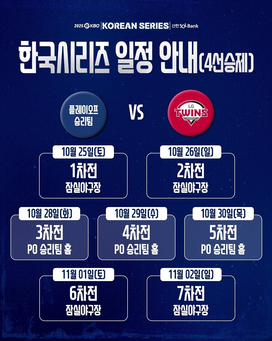 | 한국시리즈 | LG vs PO 승 | 10/25~11/2 | 2–3–2 / LG 홈 시작·종료 |