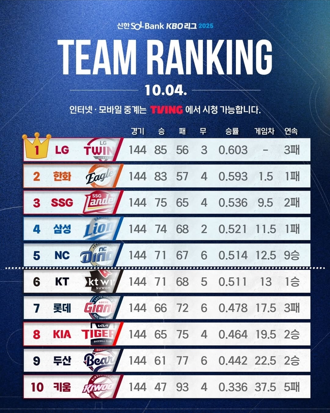 - 대진: 삼성 라이온즈 (4위) vs NC 다이노스 (5위)