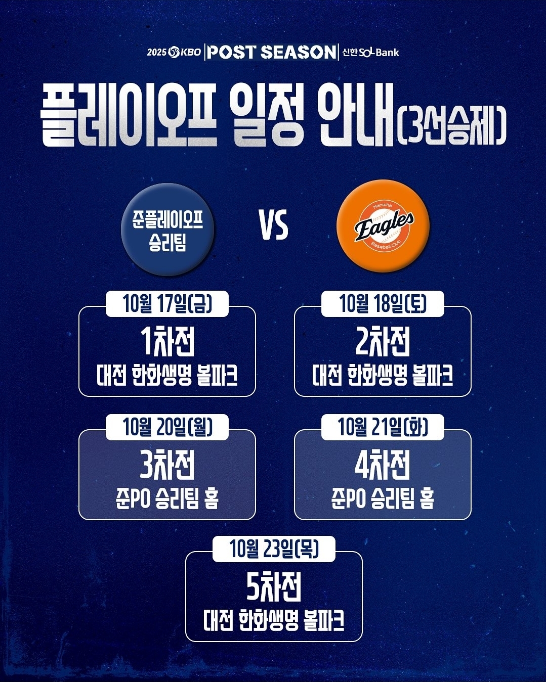 | PO | 한화 vs 준PO 승 | 10/17~23 | 1~2차 대전 한화 홈 |