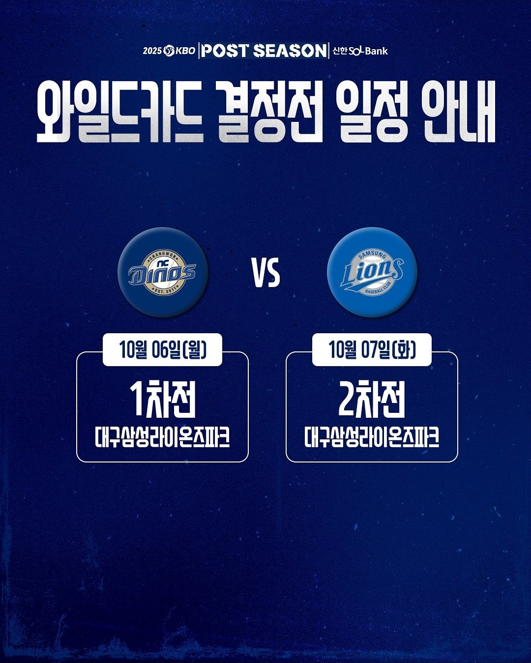 | 와일드카드 | 삼성 vs NC | 10/6~7 | 삼성 홈, 1무 이상 시 진출 |