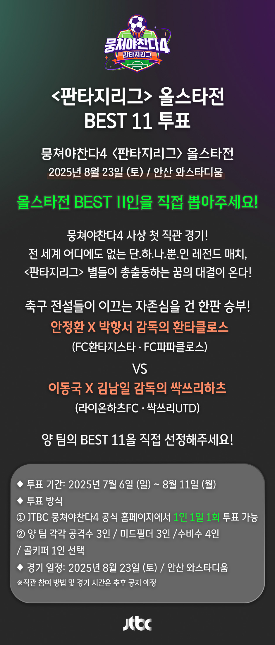 JTBC ‘뭉쳐야 찬다4’ 사상 첫 직관 경기 개최! 8월 23일 안산와스타디움에서 열리는 레전드 매치 일정, 티켓 신청, BEST11 투표 총정리.